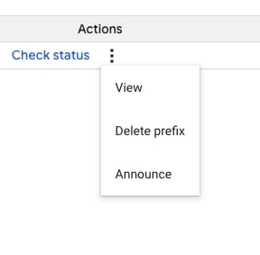 Click on the three-dot menu under Actions and select "Announce" to start advertising your prefix from Google's network.