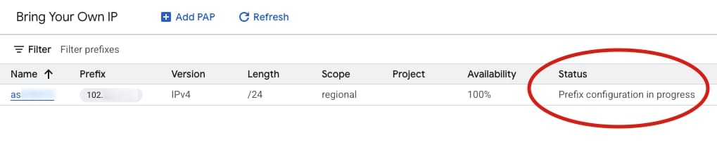 After validation completes, you'll see your PAP listed with "Prefix configuration in progress" status. This is where patience comes in.