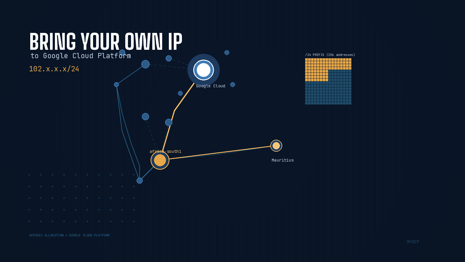 When migrating workloads to the cloud, one of the most overlooked challenges is IP address management. Organizations that have built their reputation, whitelists, and infrastructure around specific IP addresses often face a difficult choice: abandon those trusted addresses or maintain expensive on-premises equipment just to keep using them. This challenge is particularly relevant in Mauritius, where Internet leased circuit offerings remain "unfortunately" expensive, making it impractical for small networks to manage their own IP number resources on-premises. Google Cloud's Bring Your Own IP (BYOIP) feature solves this problem, and for organizations in Africa and the Indian Ocean region holding AFRINIC allocations, it opens up exciting possibilities.