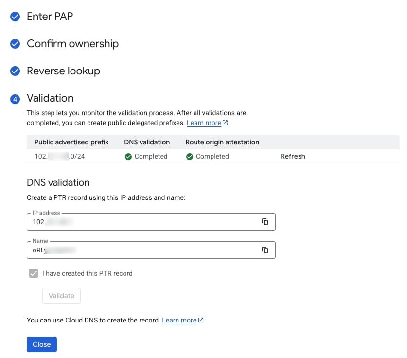 The final step is validation. Google Cloud verifies your ownership through two methods: DNS validation and Route origin attestation. For DNS validation, you'll need to create a PTR record using the IP address and name provided. The ROA validation checks against the RPKI to confirm that you've authorized Google's ASN to announce your prefix.