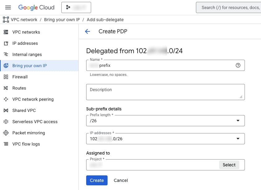 Once your PDPs are provisioned, you can delegate sub-prefixes to specific projects within your organization. This is where BYOIP shines for enterprise environments—you can maintain centralized control over your IP address space while allowing individual teams to use addresses in their projects.