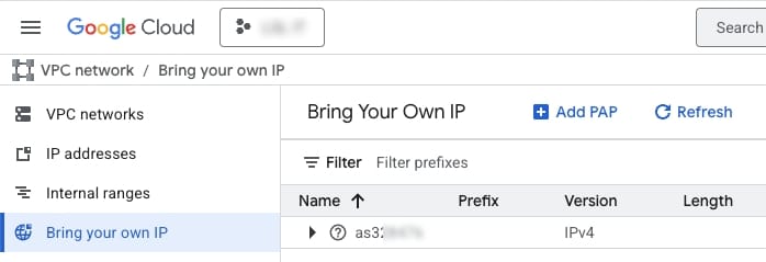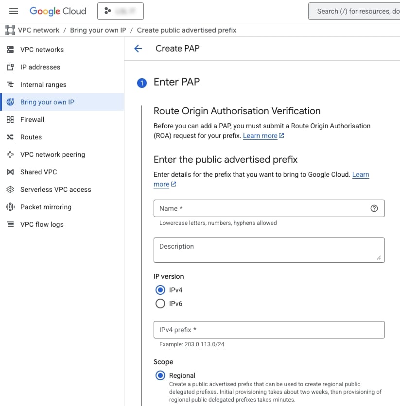 With the ROA in place, navigate to the VPC network section in Google Cloud Console. The process begins by creating your Public Advertised Prefix.