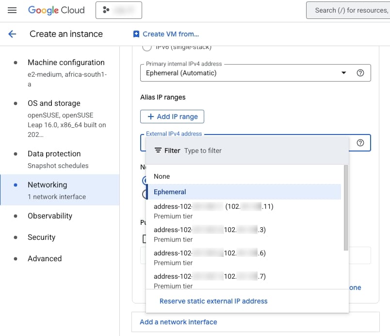 Notice in the screenshot that the BYOIP addresses (the 102.x.x.x addresses) appear in the dropdown with "Premium tier" — these are your AFRINIC-allocated addresses now usable directly on Google Cloud! Also notice the machine is being created in africa-south1-a and running openSUSE Leap 16.0. 😉