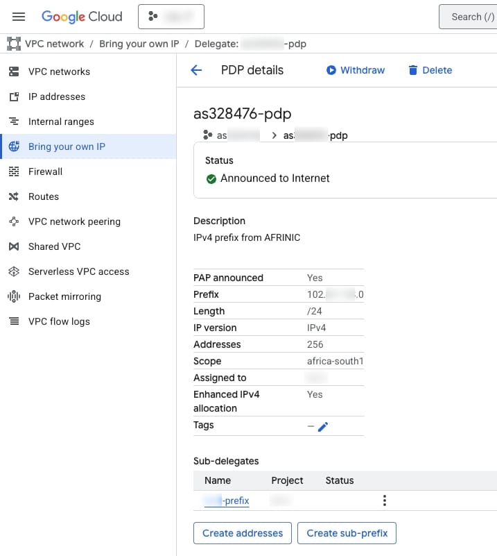 From the PDP details page, you can see all the information about your Public Delegated Prefix — the status (hopefully "Announced to Internet" ✅), the prefix details, scope, and any existing sub-delegates. Notice in the screenshot below that the scope is set to africa-south1.