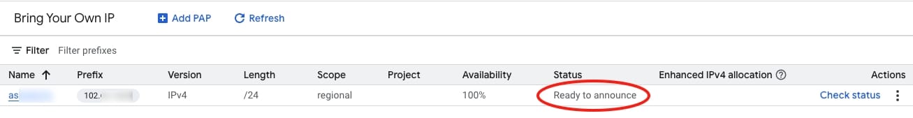After announcing, your prefix will be advertised to the Internet from Google Cloud's infrastructure. You can now create Public Delegated Prefixes and start using your BYOIP addresses.